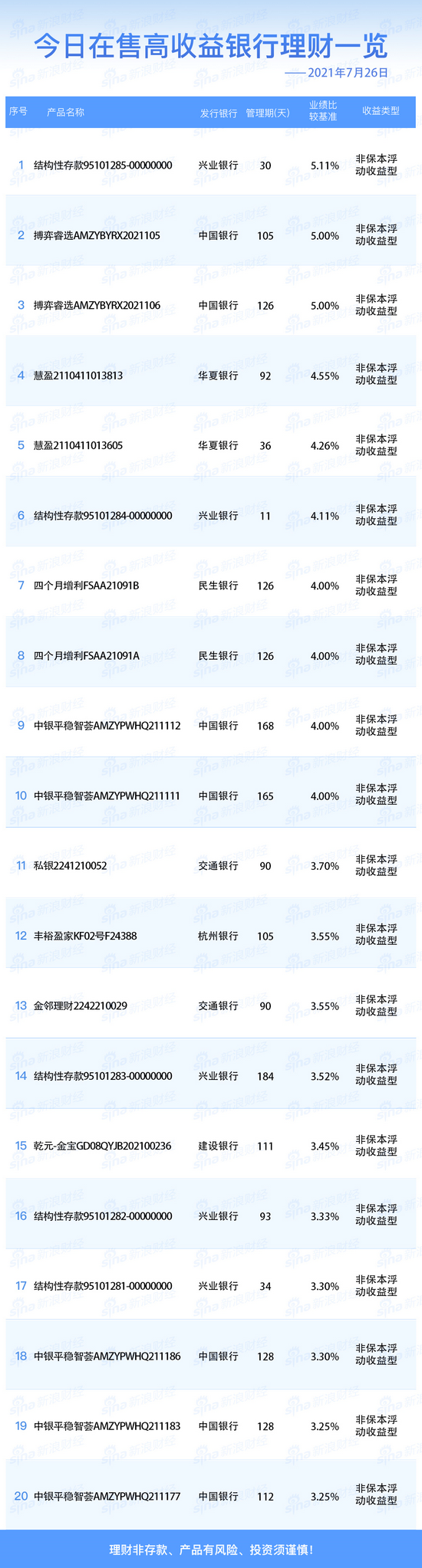 •   新浪财经7月26日在售高收益银行理财产品:今日业绩比较基准在4.00%以上的银行人民币理财产品共10款。兴业银行的“结构性存款95101285-00000000”业绩比较基准最高,为5.11%。