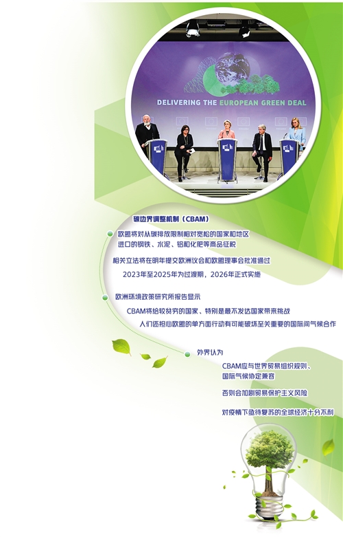 有人担心,欧盟新出台的碳边界调整机制(CBAM)会不会成为阻碍全球贸易和投资自由化的那堵关税墙?这种担心并非空穴来风或杞人忧天。毕竟欧盟占世界贸易的15%、约占全球GDP的16%和年度温室气体排放量的9%,一举一动都将产生全球影响。当然,其中的是非曲直一时半会儿很难下定论,还要看将来具体的实施细则。