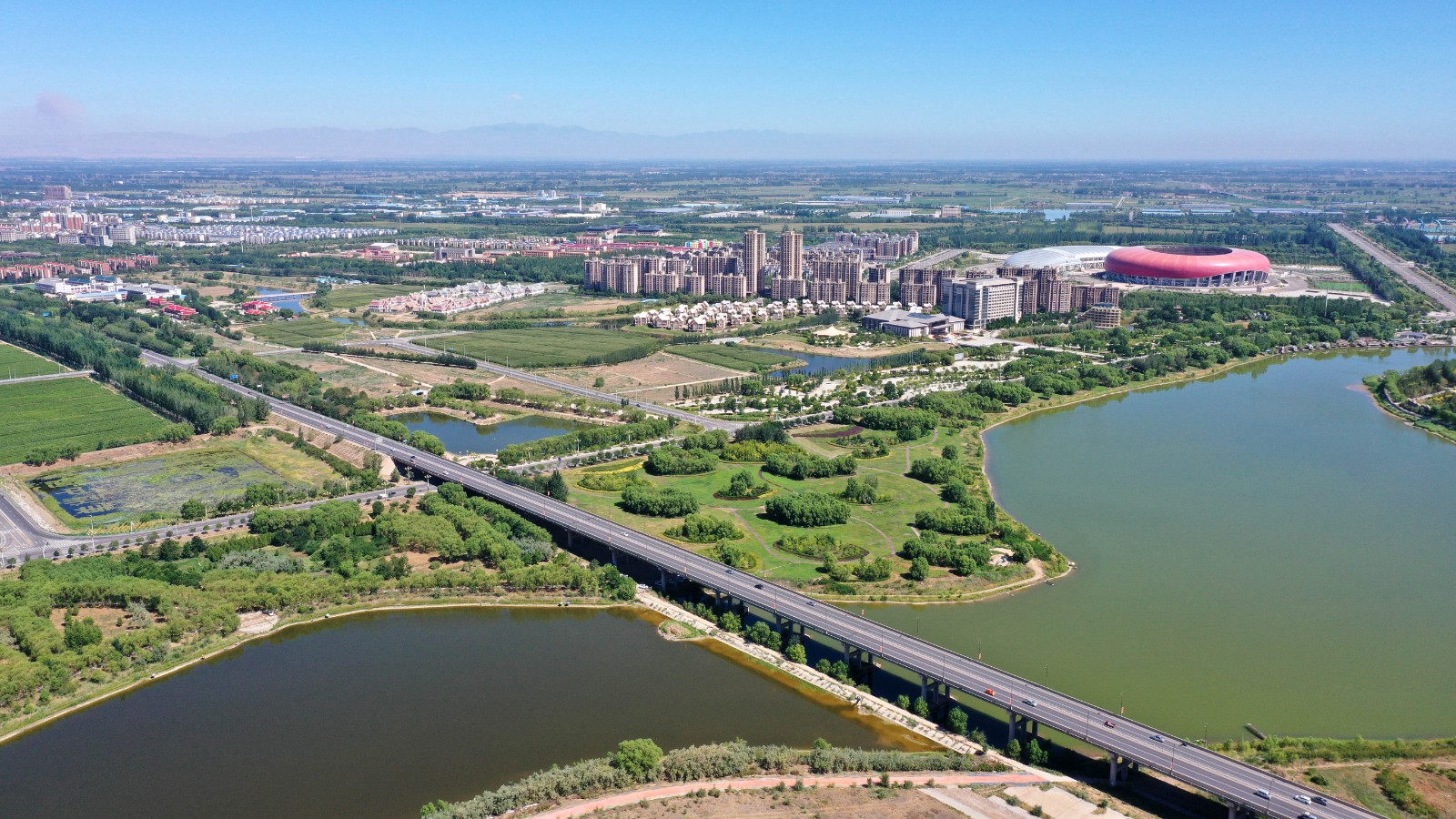 水系环绕的青铜峡市(8月5日摄,无人机照片)。