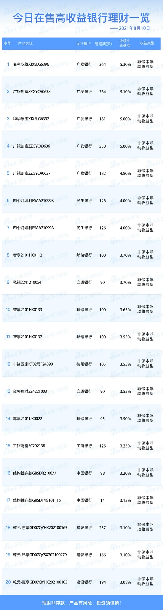 •   新浪财经8月10日在售高收益银行理财产品:今日业绩比较基准在4%以上的银行人民币理财产品共7款。广发银行的“名利双收XJXSLG6396”业绩比较基准最高,为5.30%。