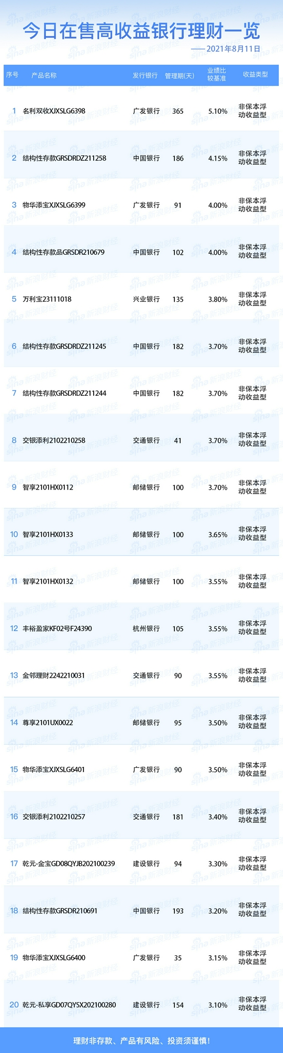 •   新浪财经8月11日在售高收益银行理财产品:今日业绩比较基准在4%以上的银行人民币理财产品共4款。广发银行的“名利双收XJXSLG6398”业绩比较基准最高,为5.10%。