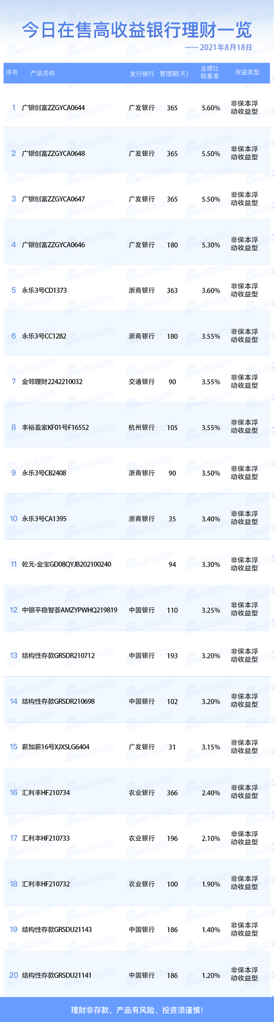 银行8月18日在售高收益理财产品
