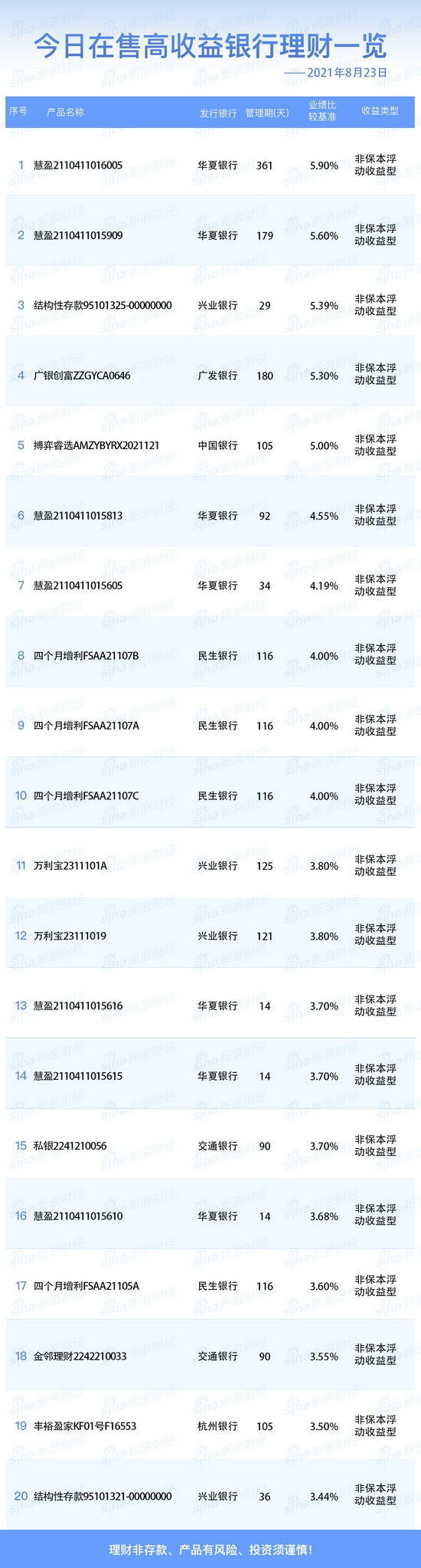 •   新浪财经8月23日在售高收益银行理财产品:今日业绩比较基准在4.60%以上的银行人民币理财产品共5款。华夏银行的“慧盈2110411016005”业绩比较基准最高,为5.90%。