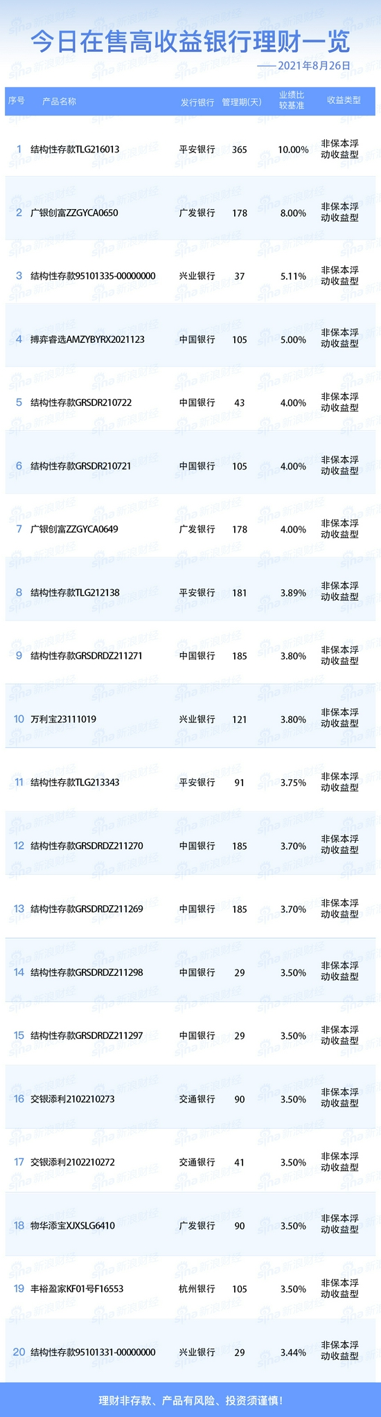 •   新浪财经8月26日在售高收益银行理财产品:今日业绩比较基准在3.90%以上的银行人民币理财产品共7款。平安银行的“结构性存款TLG216013”业绩比较基准最高,为1000%。