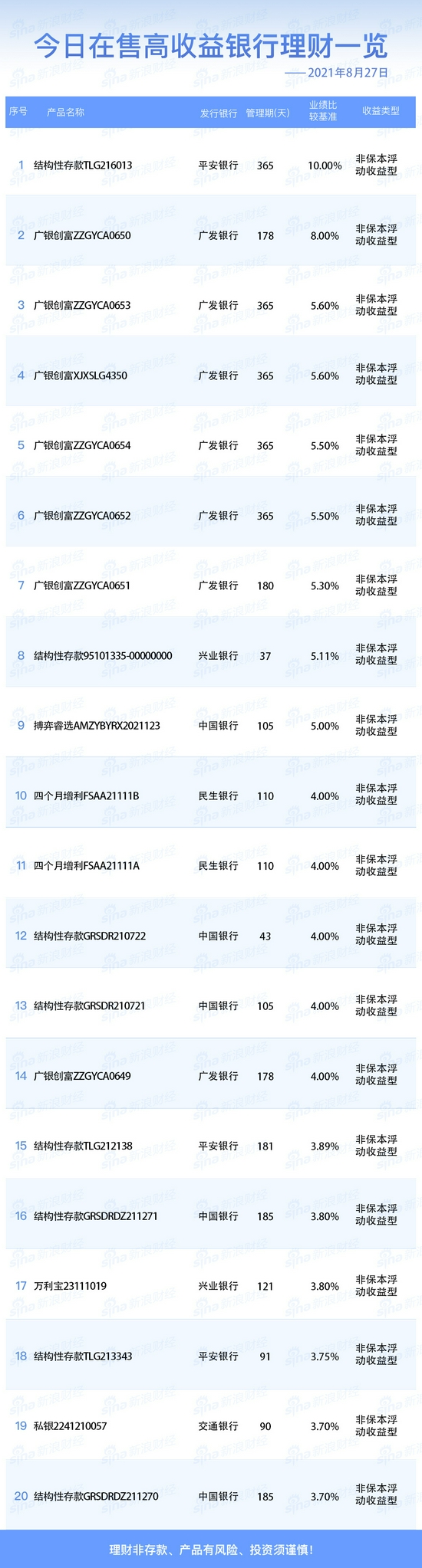 银行8月27日在售高收益理财产品