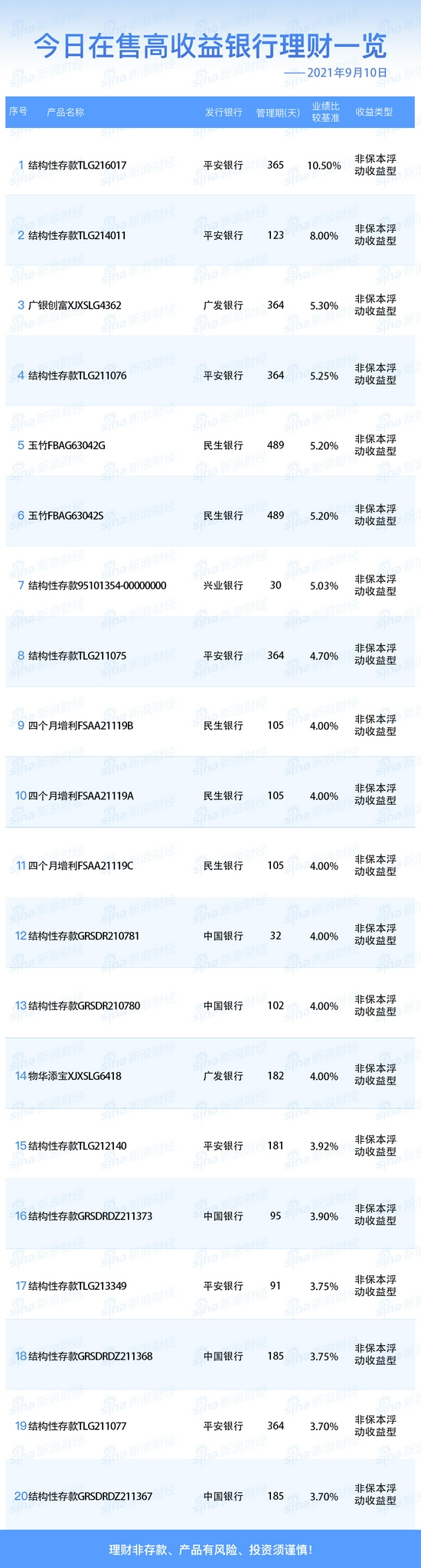 •   新浪财经9月10日在售高收益银行理财产品:今日业绩比较基准在5%以上的银行人民币理财产品共5款。平安银行的“结构性存款TLG216017”业绩比较基准最高,为10.5%。