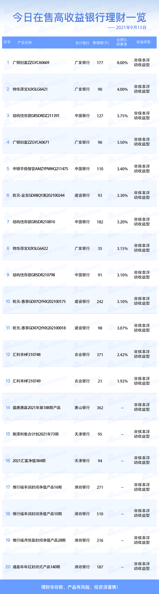 •   新浪财经9月15日在售高收益银行理财产品:今日业绩比较基准在3.50%以上的银行人民币理财产品共4款。广发银行的“广银创富ZZGYCA0669”业绩比较基准最高,为5.30%。
