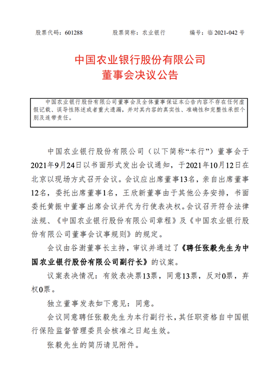 农业银行:张毅就任副行长