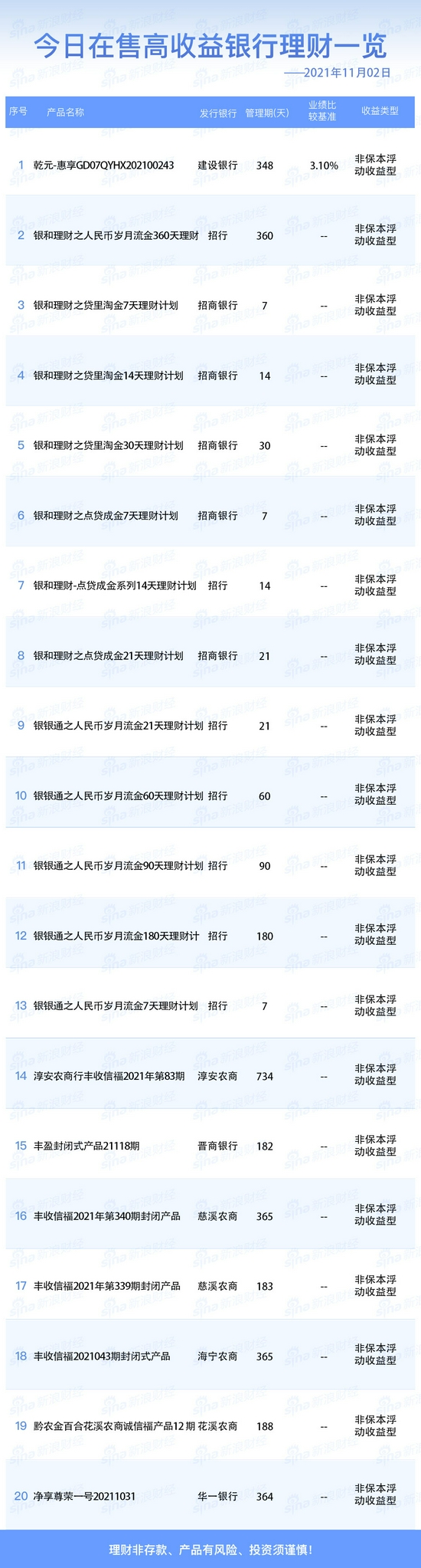 •   新浪财经11月2日在售高收益银行理财产品:今日业绩比较基准在3%以上的银行人民币理财产品共1款。建设银行的“乾元-惠享GD07QYHX202100243”业绩比较基准最高,为3.10%。
