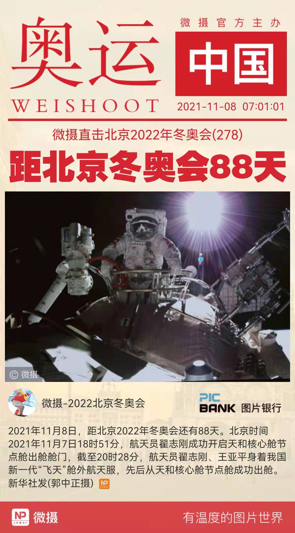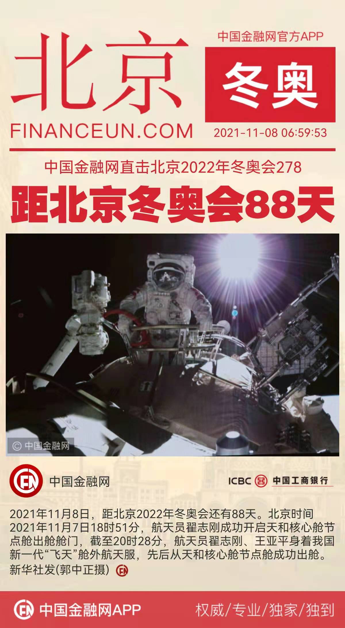 2021年11月8日,距北京2022年冬奥会还有88天。北京时间2021年11月7日18时51分,航天员翟志刚成功开启天和核心舱节点舱出舱舱门,截至20时28分,航天员翟志刚、王亚平身着我国新一代“飞天”舱外航天服,先后从天和核心舱节点舱成功出舱。