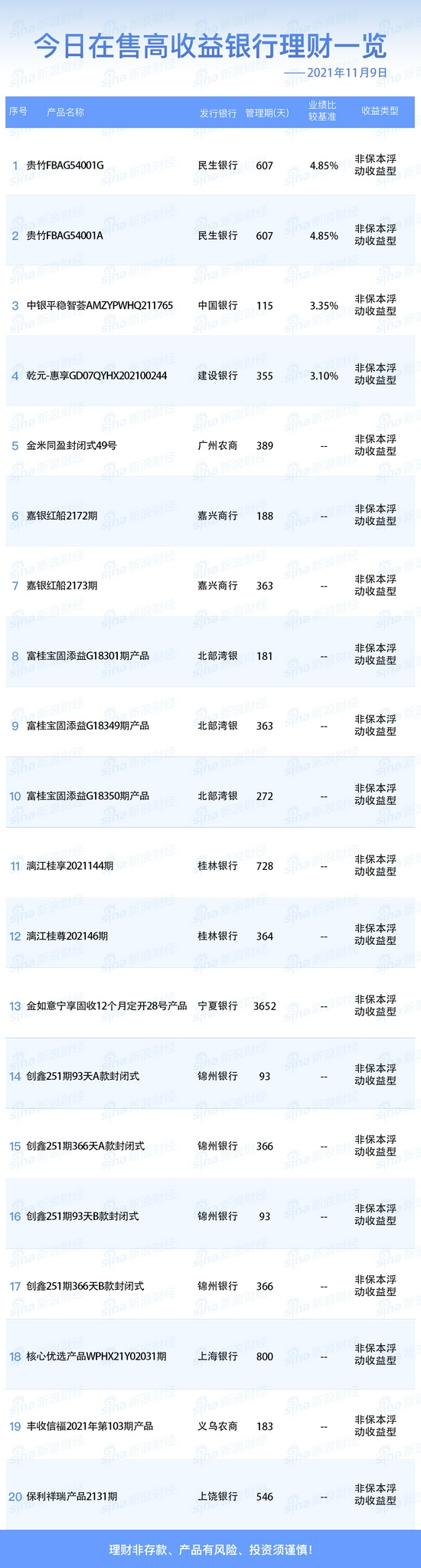 •   新浪财经11月9日在售高收益银行理财产品:今日业绩比较基准在3.25%以上的银行人民币理财产品共3款。民生银行的“贵竹FBAG54001G”业绩比较基准最高,为4.85%。