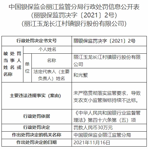 丽江永胜长江村镇银行被罚30万 2020年11月04日11时40分