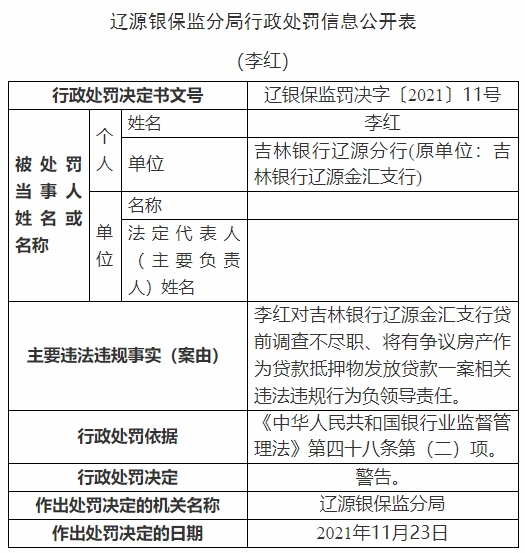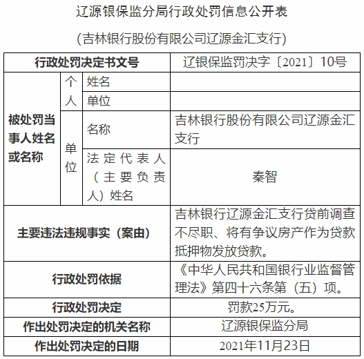 吉林银行违法放贷掩盖不良被处罚 行长遭警告
