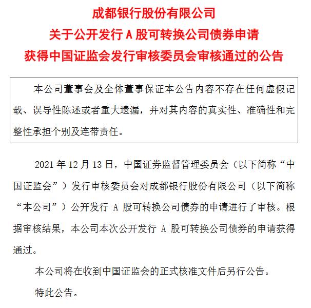 成都银行:拟公开发行总额不超80亿元可转债 2021年04月29日10时58分