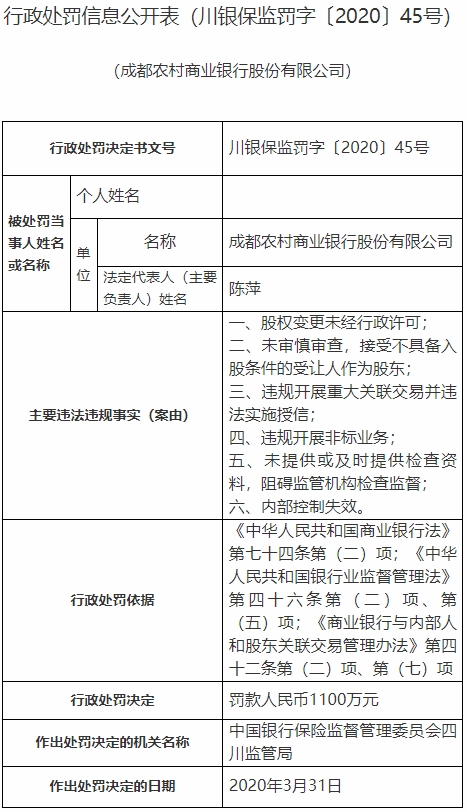 川银保监罚字〔2020〕45号显示,成都农商银行存在股权变更未经行政许可;未审慎审查,接受不具备入股条件的受让人作为股东;违规开展重大关联交易并违法实施授信;违规开展非标业务;未提供或及时提供检查资料,阻碍监管机构检查监督;内部控制失效六宗违法违规事实。