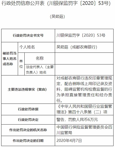 川银保监罚字〔2020〕53号显示,吴茹菇对成都农商银行违反印章管理规定,配合删除线上用印记录及资料,阻碍监管机构检查监督的行为承担直接管理责任和经办责任。根据《中华人民共和国银行业监督管理法》第四十八条第(二)项,中国银行保险监督管理委员会四川监管局对其警告,罚款人民币6万元。