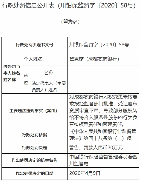 川银保监罚字〔2020〕58号显示,瞿隽彦对成都农商银行股权变更未按要求报经监管部门批准,受让股东资质审查不严、导致部分股权转给不符合入股条件股东的行为负直接领导责任和管理责任。根据《中华人民共和国银行业监督管理法》第四十八条第(二)项,中国银行保险监督管理委员会四川监管局对其警告,罚款人民币20万元。
