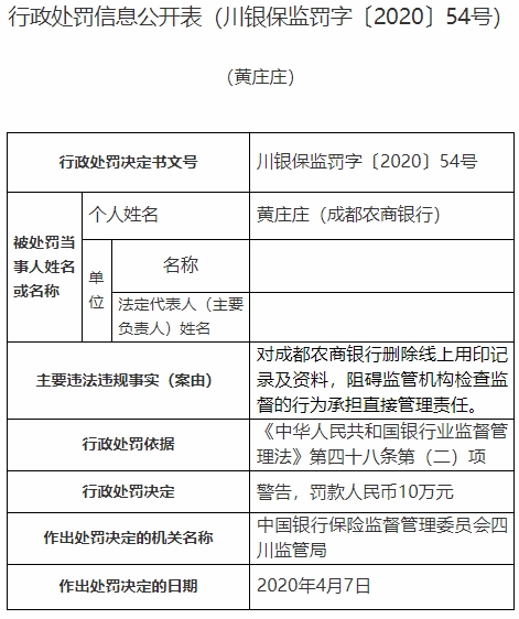 川银保监罚字〔2020〕54号显示,黄庄庄对成都农商银行删除线上用印记录及资料,阻碍监管机构检查监督的行为承担直接管理责任。根据《中华人民共和国银行业监督管理法》第四十八条第(二)项,中国银行保险监督管理委员会四川监管局对其警告,罚款人民币10万元。