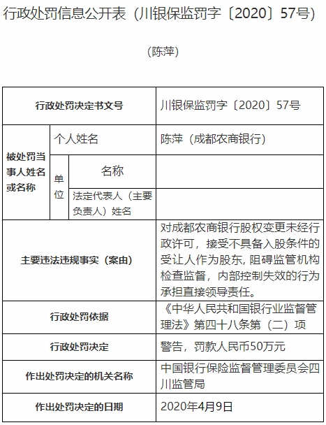 川银保监罚字〔2020〕57号显示,陈萍对成都农商银行股权变更未经行政许可,接受不具备入股条件的受让人作为股东,阻碍监管机构检查监督,内部控制失效的行为承担直接领导责任。根据《中华人民共和国银行业监督管理法》第四十八条第(二)项,中国银行保险监督管理委员会四川监管局对其警告,罚款人民币50万元。