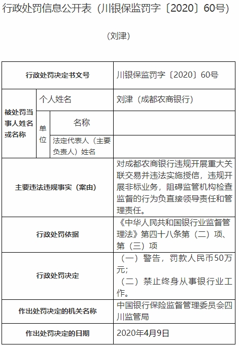 川银保监罚字〔2020〕60号显示,刘津对成都农商银行违规开展重大关联交易并违法实施授信,违规开展非标业务,阻碍监管机构检查监督的行为负直接领导责任和管理责任。根据《中华人民共和国银行业监督管理法》第四十八条第(二)项、第(三)项,中国银行保险监督管理委员会四川监管局对其警告,罚款人民币50万元;禁止终身从事银行业工作。