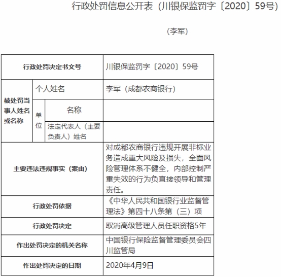 川银保监罚字〔2020〕59号显示,李军对成都农商银行违规开展非标业务造成重大风险及损失,全面风险管理体系不健全,内部控制严重失效的行为负直接领导和管理责任。根据《中华人民共和国银行业监督管理法》第四十八条第(三)项,中国银行保险监督管理委员会四川监管局对其取消高级管理人员任职资格5年。