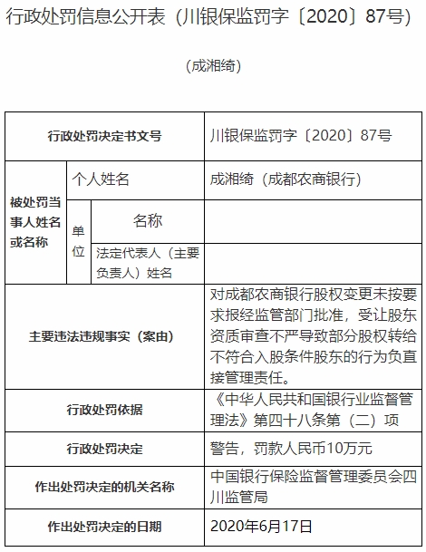 成湘绮对成都农商银行股权变更未按要求报经监管部门批准,受让股东资质审查不严导致部分股权转给不符合入股条件股东的行为负直接管理责任。根据《中华人民共和国银行业监督管理法》第四十八条第(二)项,中国银行保险监督管理委员会四川监管局对其警告,罚款人民币10万元。