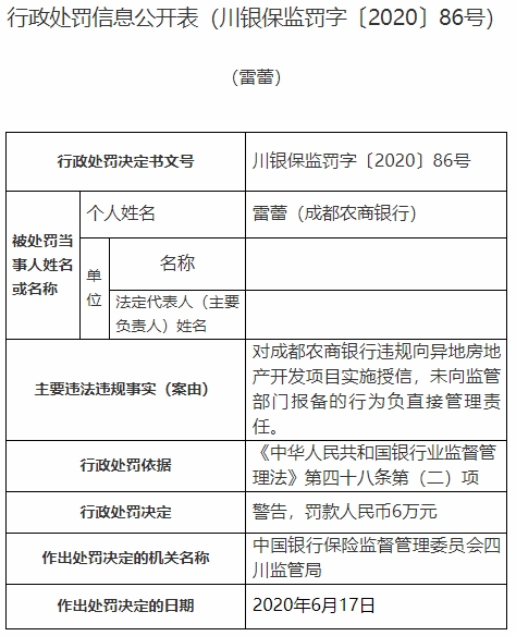 川银保监罚字〔2020〕86号显示,雷蕾对成都农商银行违规向异地房地产开发项目实施授信,未向监管部门报备的行为负直接管理责任。根据《中华人民共和国银行业监督管理法》第四十八条第(二)项,中国银行保险监督管理委员会四川监管局对其警告,罚款人民币6万元。