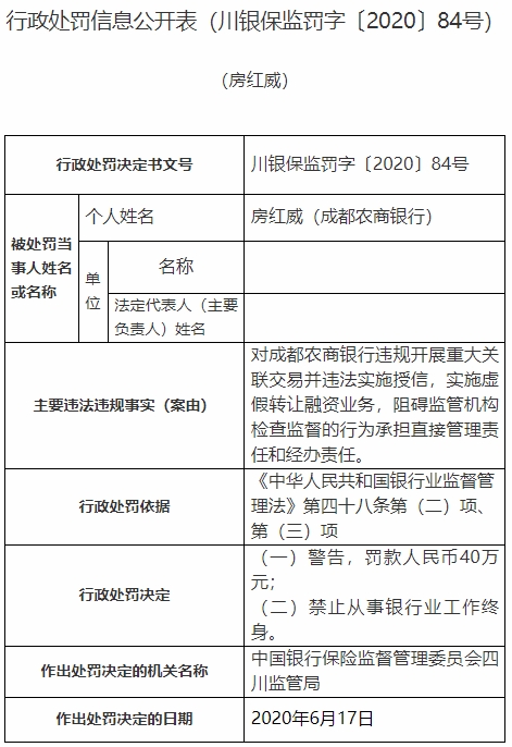 川银保监罚字〔2020〕84号显示,房红威对成都农商银行违规开展重大关联交易并违法实施授信,实施虚假转让融资业务,阻碍监管机构检查监督的行为承担直接管理责任和经办责任。根据《中华人民共和国银行业监督管理法》第四十八条第(二)项、第(三)项,中国银行保险监督管理委员会四川监管局对其警告,罚款人民币40万元;禁止从事银行业工作终身。
