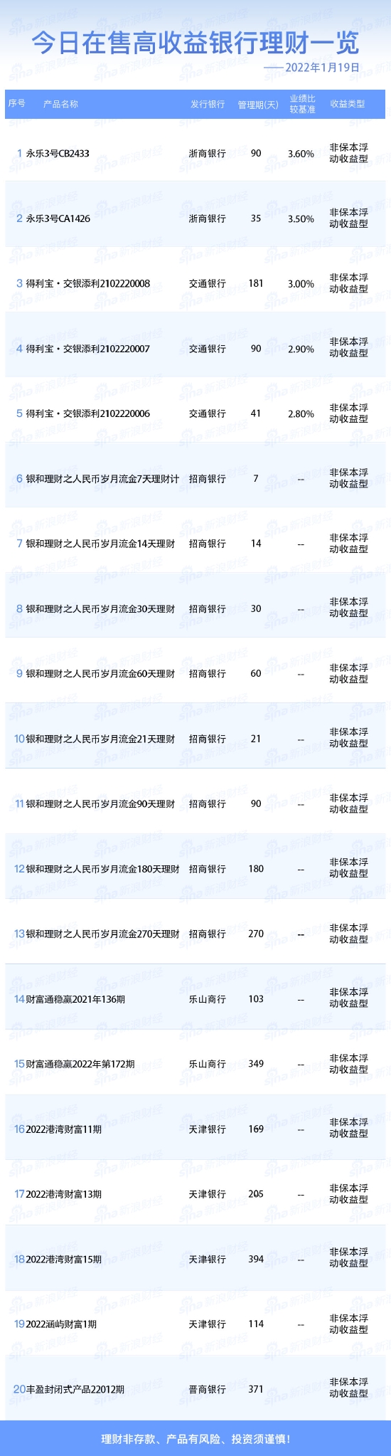 •   新浪财经1月19日在售高收益银行理财产品一览:今日业绩比较基准在2.80%及以上的银行人民币理财产品共5款。理财非存款、产品有风险、投资须谨慎!