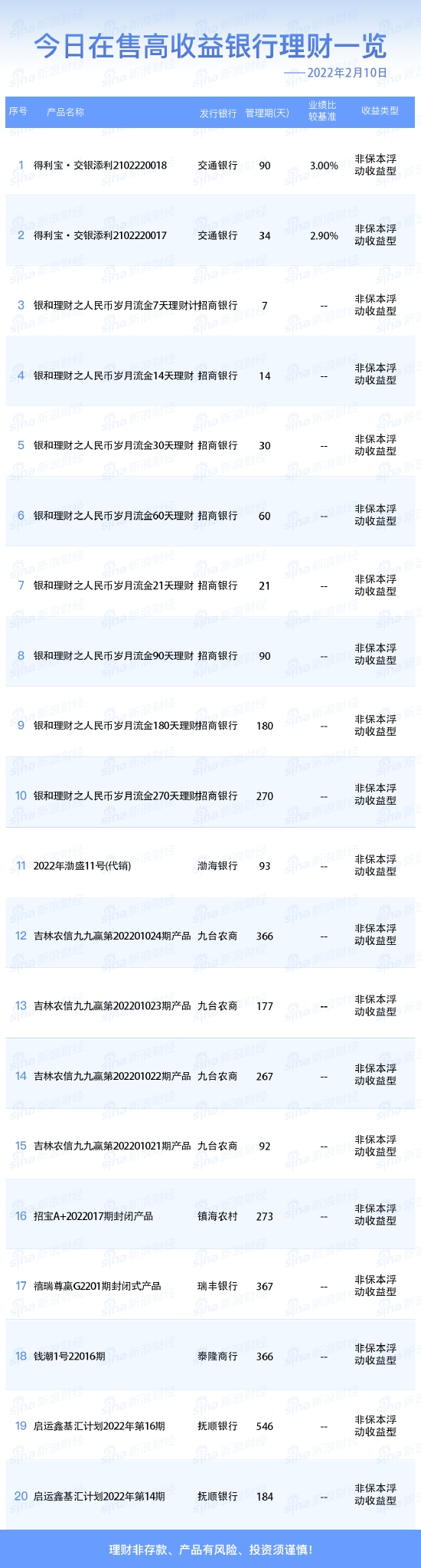 银行2月10日在售高收益理财产品