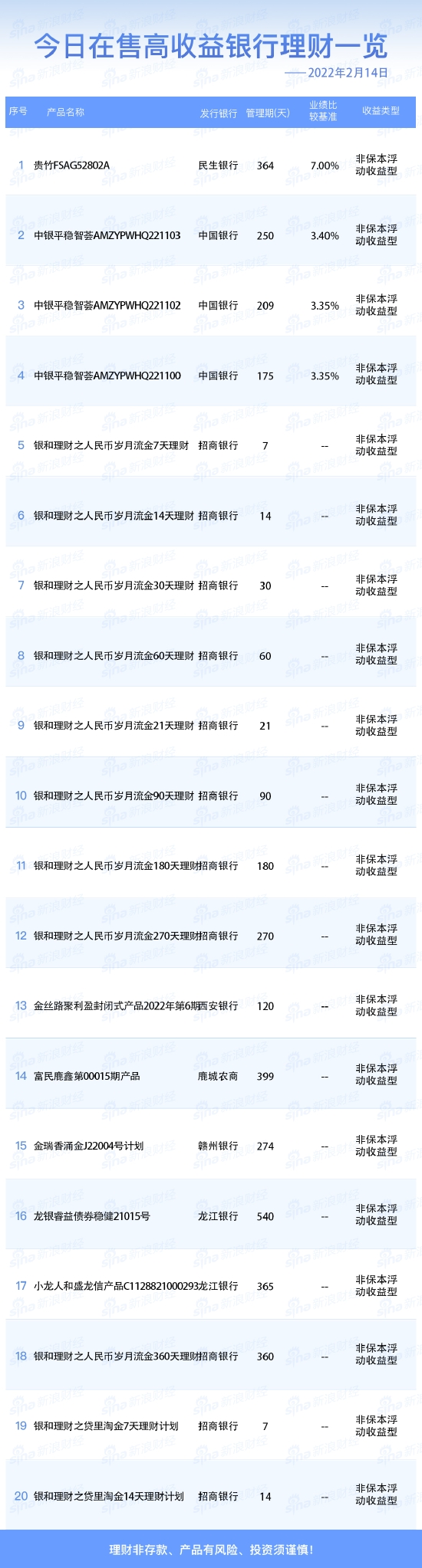 •   新浪财经2月14日在售高收益银行理财产品一览:今日业绩比较基准在3.35%及以上的银行人民币理财产品共4款。理财非存款、产品有风险、投资须谨慎!