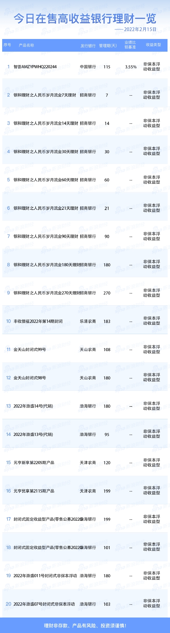 •   新浪财经2月15日在售高收益银行理财产品一览:今日业绩比较基准在3.55%及以上的银行人民币理财产品共1款。理财非存款、产品有风险、投资须谨慎!