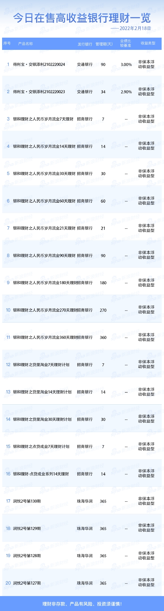 •   新浪财经2月18日在售高收益银行理财产品一览:今日业绩比较基准在2.90%及以上的银行人民币理财产品共2款。理财非存款、产品有风险、投资须谨慎!