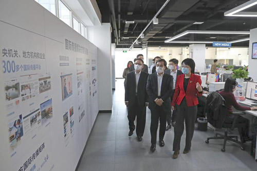 中国银行董事长刘连舸一行参观中国日报社融媒体中心,中国日报社总编辑周树春、编委兼秘书长朱宝霞陪同参观。
