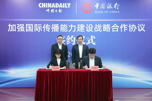 中国银行副行长陈怀宇、中国日报社副总编辑刘伟玲代表双方签署合作协议。中国银行董事长刘连舸、中国日报社总编辑周树春见证签约。