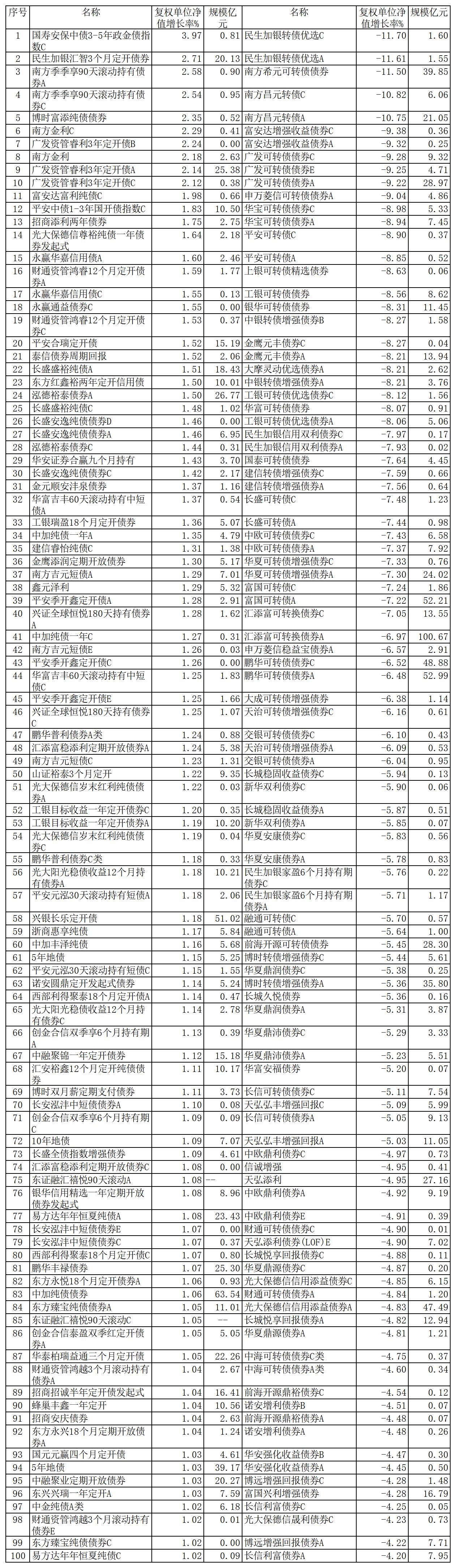 排名其后的基金分别是民生加银汇智3个月定开债券、南方季季享90天滚动持有债券A、南方季季享90天滚动持有债券C、博时富添纯债债券、南方金利C、广发资管睿利3年定开债B、南方金利、广发资管睿利3年定开债A、广发资管睿利3年定开债C,涨幅分别是2.71%、2.58%、2.54%、2.35%、2.29%、2.24%、2.18%、2.14%、2.12%。这些债基都为纯债基金,持仓主要是政策性金融债、企业债。