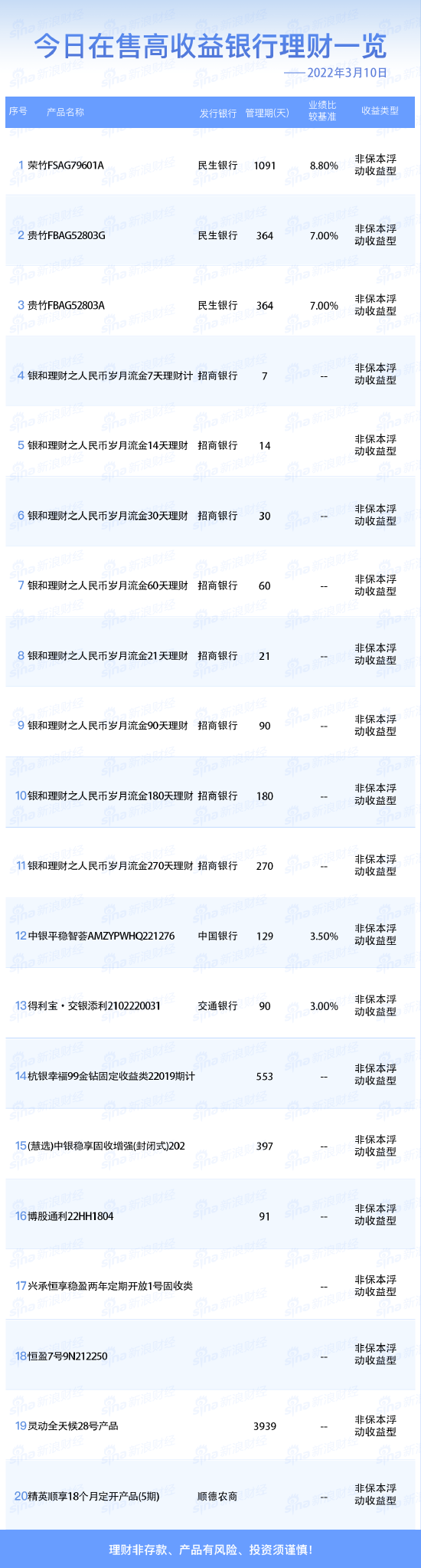 •   新浪财经3月10日在售高收益银行理财产品一览。今日业绩比较基准在3.00%及以上的银行人民币理财产品共5款。理财非存款、产品有风险、投资须谨慎!