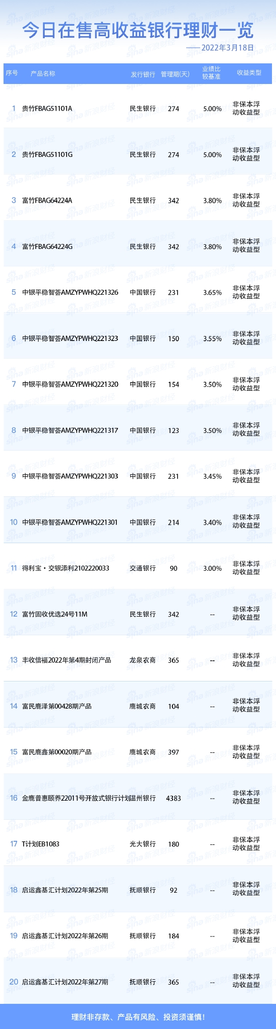 •   新浪财经3月18日在售高收益银行理财产品一览。今日业绩比较基准在3.00%及以上的银行人民币理财产品共11款。理财非存款、产品有风险、投资须谨慎!