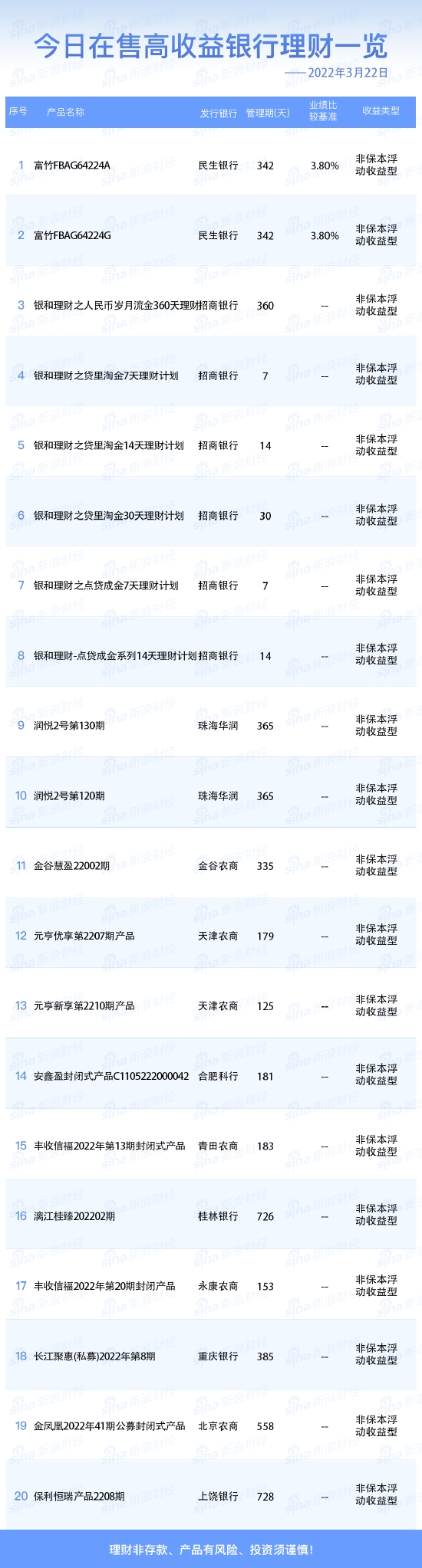 •   新浪财经3月22日在售高收益银行理财产品一览。今日业绩比较基准在3.80%及以上的银行人民币理财产品共2款。理财非存款、产品有风险、投资须谨慎!