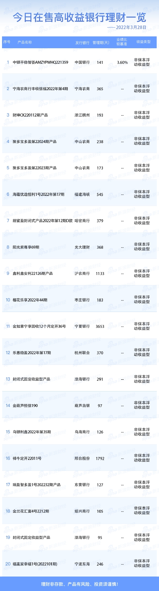 •   新浪财经3月28日在售高收益银行理财产品一览。今日业绩比较基准在3.60%及以上的银行人民币理财产品共1款。理财非存款、产品有风险、投资须谨慎!