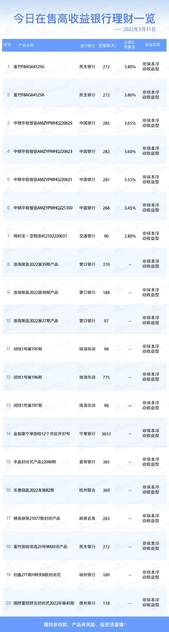 •   新浪财经3月31日在售高收益银行理财产品一览。今日业绩比较基准在2.80%及以上的银行人民币理财产品共7款。理财非存款、产品有风险、投资须谨慎!