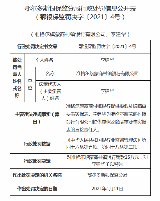 准格尔旗蒙商村镇银行违规被罚