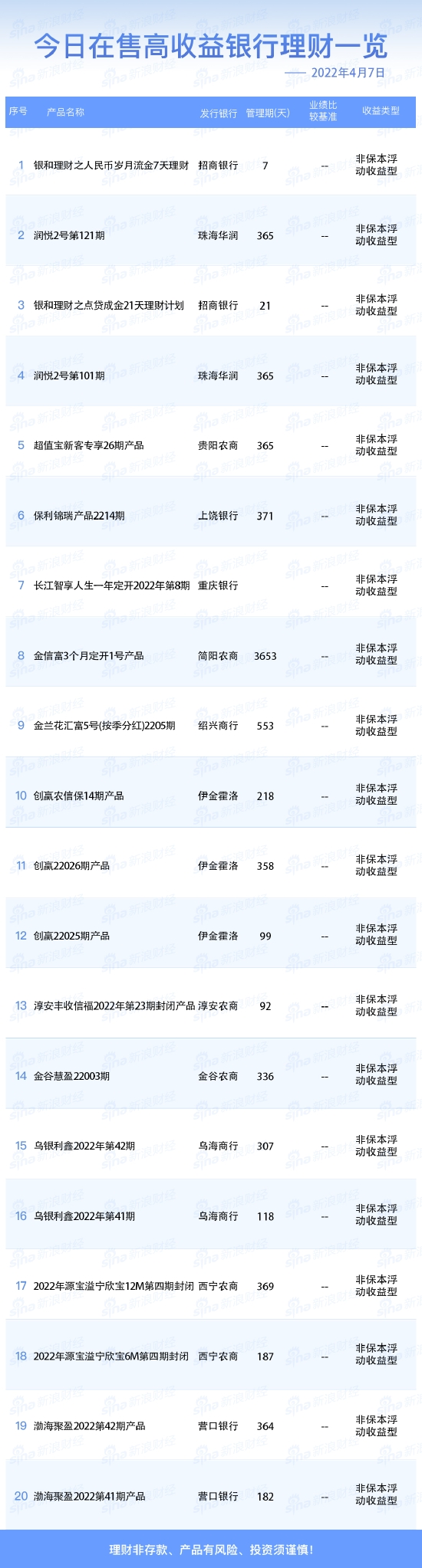 •        新浪财经4月7日在售高收益银行理财产品一览。理财非存款、产品有风险、投资须谨慎!