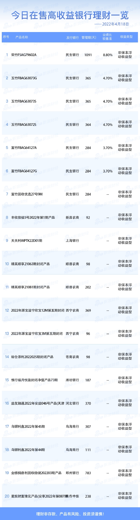 •   新浪财经4月18日在售高收益银行理财产品一览。今日业绩比较基准在3.70%及以上的银行人民币理财产品共6款。理财非存款、产品有风险、投资须谨慎!