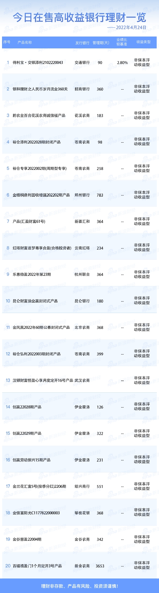 •   新浪财经4月24日在售高收益银行理财产品一览。今日业绩比较基准在2.80%及以上的银行人民币理财产品共1款。理财非存款、产品有风险、投资须谨慎!