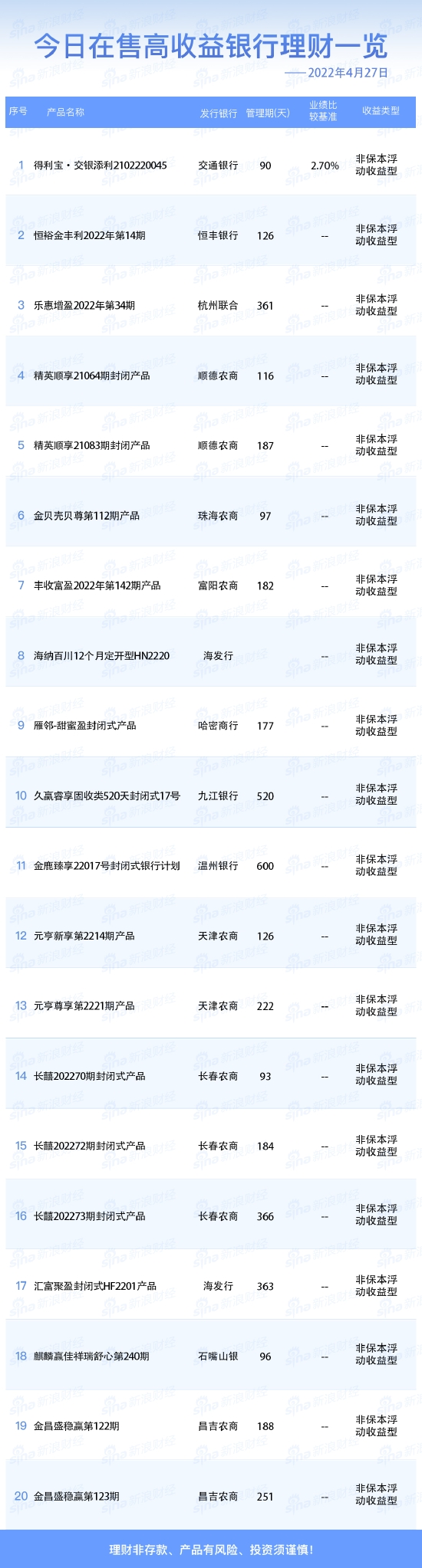 •   新浪财经4月27日在售高收益银行理财产品一览。今日业绩比较基准在2.70%及以上的银行人民币理财产品共1款。理财非存款、产品有风险、投资须谨慎!
