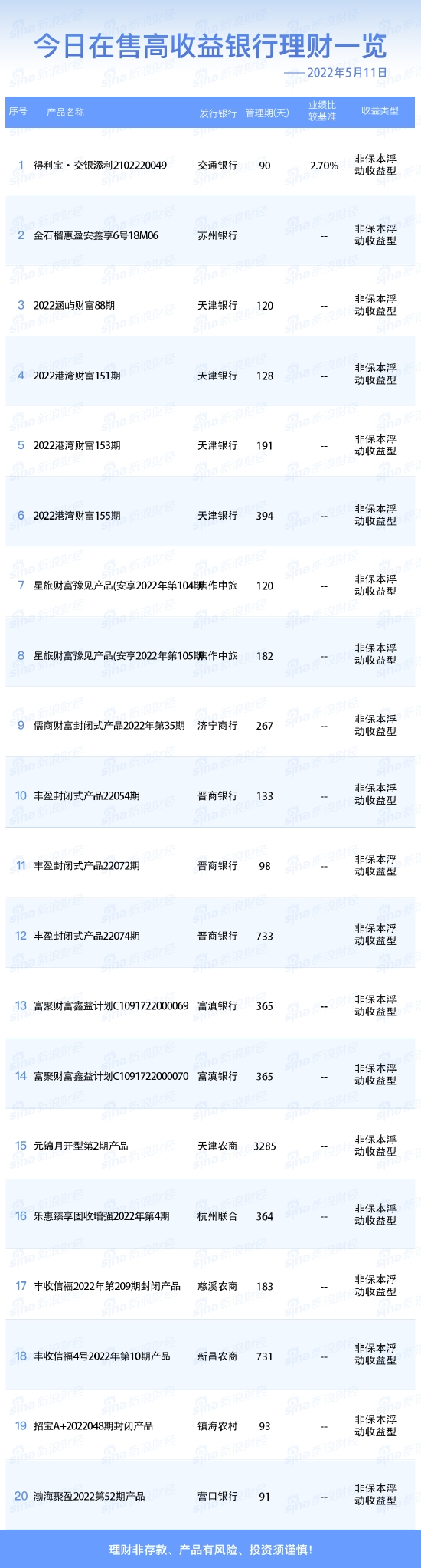 •   新浪财经5月11日在售高收益银行理财产品一览。今日业绩比较基准在2.70%及以上的银行人民币理财产品共1款。理财非存款、产品有风险、投资须谨慎!