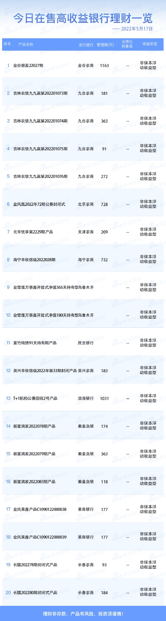 •   新浪财经5月17日在售高收益银行理财产品一览。理财非存款、产品有风险、投资须谨慎!