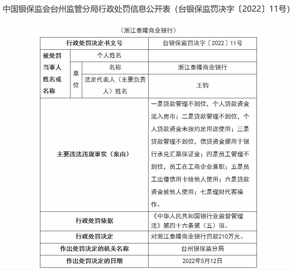 浙江泰隆商业银行两宗违法被罚
