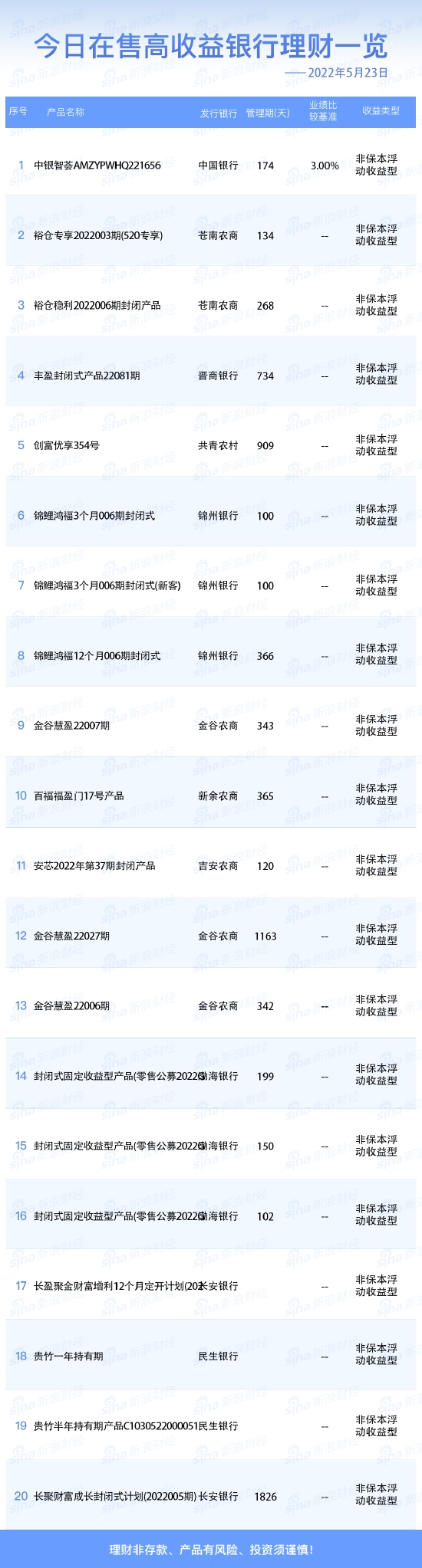 •   新浪财经5月23日在售高收益银行理财产品一览。今日业绩比较基准在3.00%及以上的银行人民币理财产品共1款。理财非存款、产品有风险、投资须谨慎!